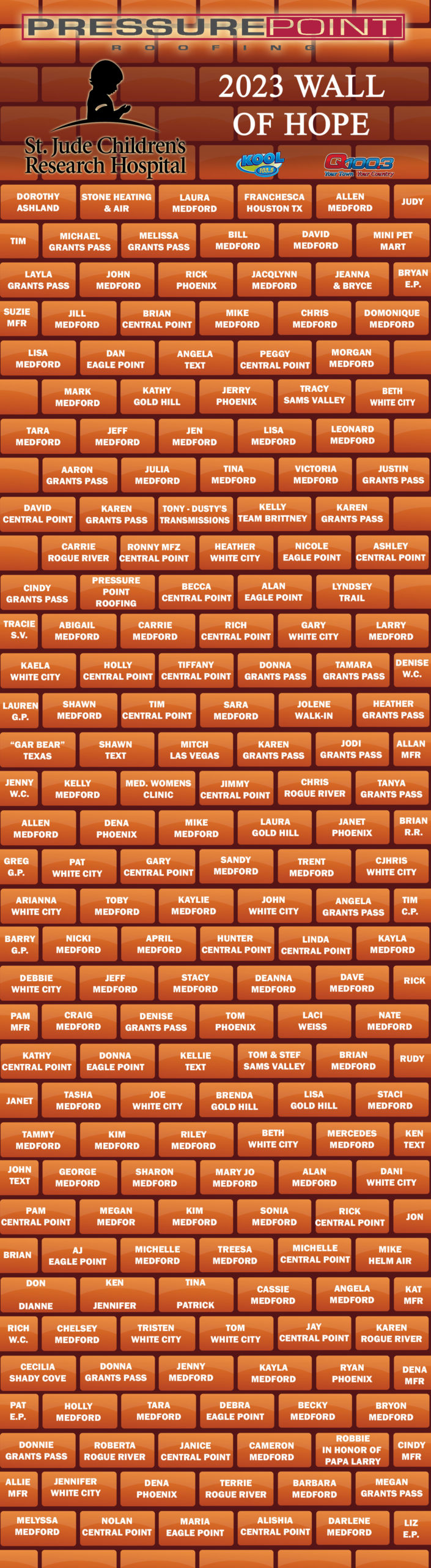 If you would like to add your name to the Pressure Point Roofing Wall of Hope,Click this link, and donate to St. Jude… https://www.stjude.org/radio/krwq